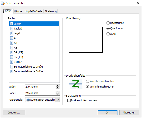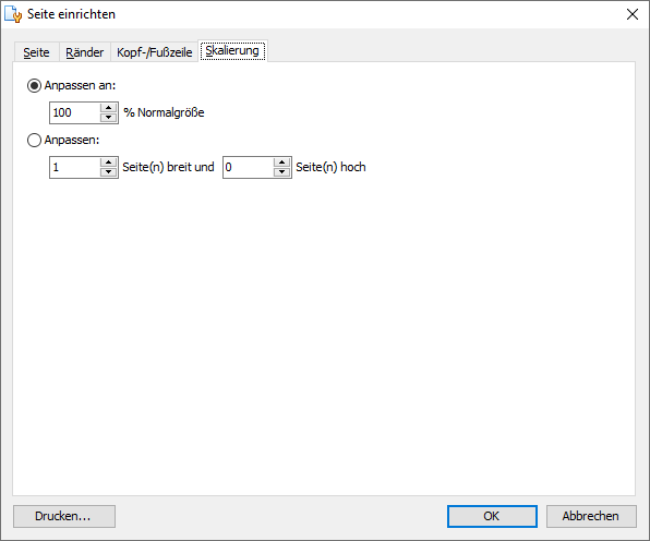 ![]() | uf der Registerkarte Skalierung kann die allgemeine Skalierung festgelegt werden. Über die prozentuelle Anpassung auf Normalgröße können insbesondere Ausdrucke, die nicht ganz auf eine Seite passen, einfach umgesetzt werden. Die Auswahl Seite anpassen ermöglicht das Einpassen des Ausdrucks auf die Seite innerhalb der Seitenränder. |