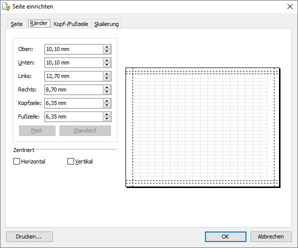 ![]() | Die Registerkarte Ränder ermöglicht die Einstellung der Seitenränder. Dabei können Änderungen auch direkt in der auf der Registerkarte angezeigten Vorschau vorgenommen werden. Dazu müssen die als gestrichelte Linien dargestellten Ränder lediglich mit der Maus verschoben werden. |