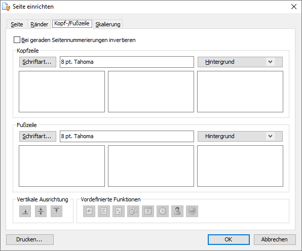 ![]() | Hier definieren Sie die Angaben für die Kopf-und Fußzeilen. Kopf- wie auch Fußzeile sind dazu in jeweils drei Bereiche eingeteilt: Eine linken, eine mittigen und einen rechten Teil. In diese Textfelder können die unter Vordefinierte Funktionen vorhandenen acht Platzhalter bzw. eine freier Text eingefügt werden. Die einzelnen vordefinierten Funktionen finden Sie in der nachfolgenden Tabelle. Zusätzlich können Schriftart bzw. -größe und die Hintergrundfarbe für Kopf-und Fußzeile getrennt angegeben werden. |