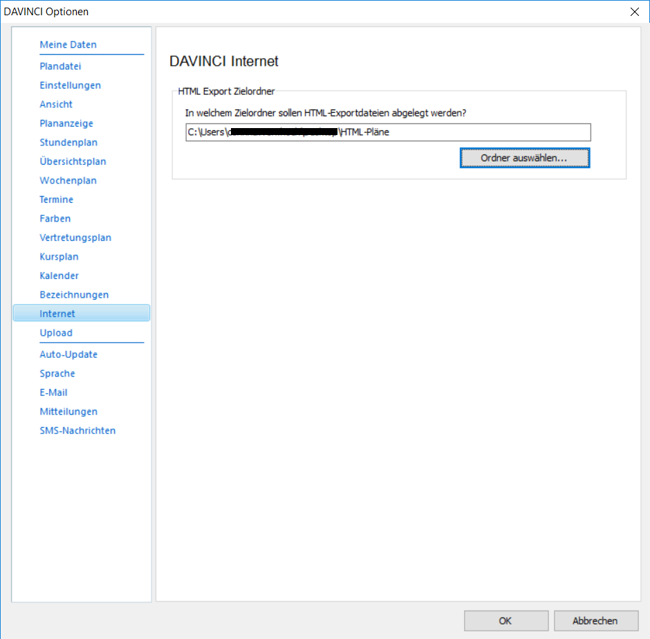Bevor Sie mit dem HTML-Export beginnen, müssen Sie im Fenster Extras > Optionen in der Ansicht Internet den Ordner für alle HTML-Exporte eingeben. Beim Exportieren von HTML-Plänen werden diese in diesem Ordner abgelegt und können von dort auf Ihre Website kopiert werden.